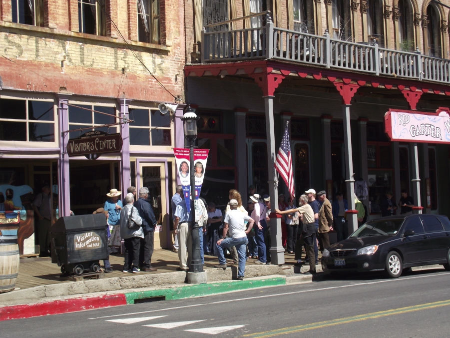 The MHAers take a mid-tour break at the Virginia City Visitors Center.Some are seeking the shade under the roof of the Red Garter Saloon.The Wells Fargo Office was located across the street.