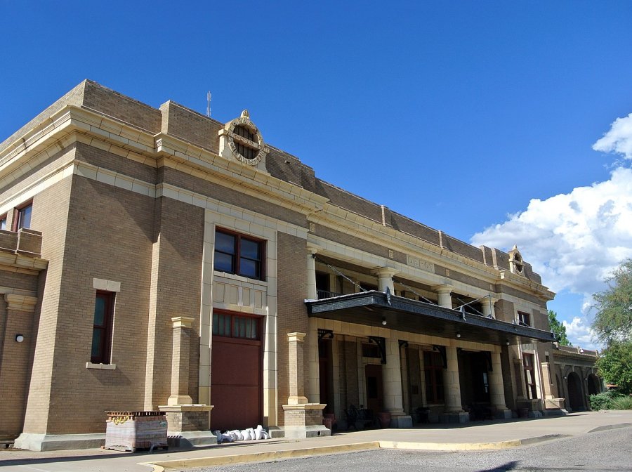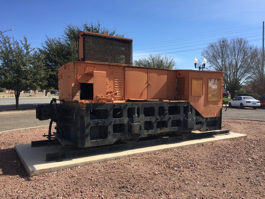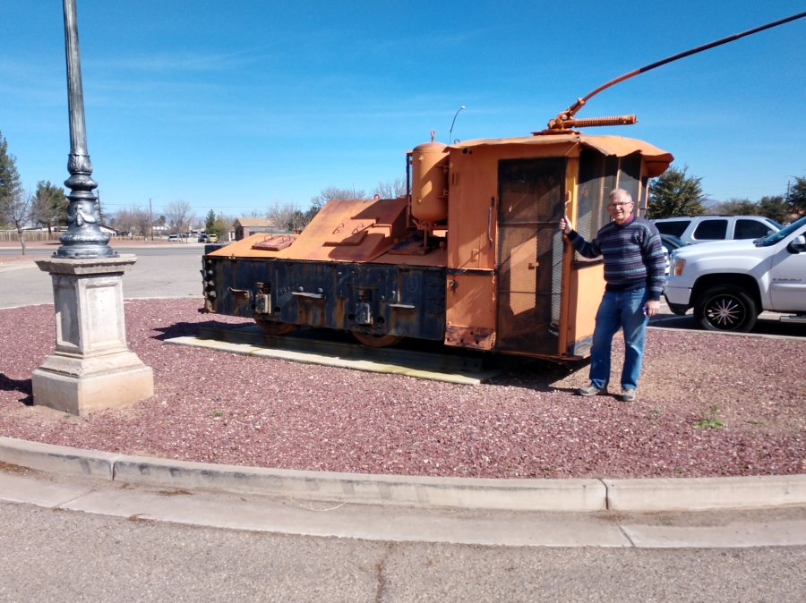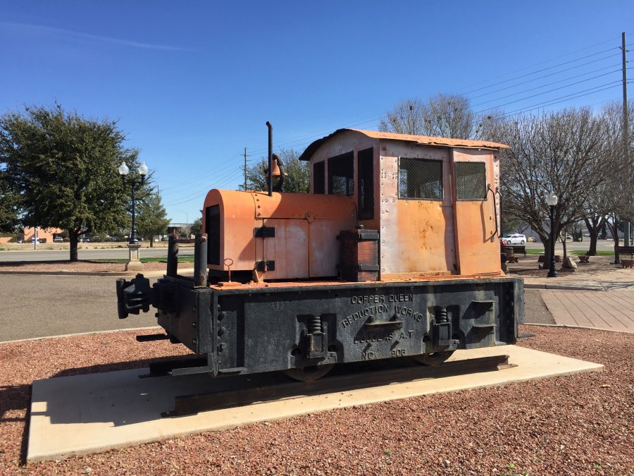 .jpg) The restored El Paso and South Western Railroad Passenger Depot in Douglas was built in1913. The railroad network once converged from all four directions. Ore from the mines in Nacozari, Mexico to the south and Bisbee to the west was transported to the Douglas Smelter. Other branches served the Sulfur Springs Valley in New Mexico to the north and El Paso, Texas to the east. The depot closed in 1961 when the line to El Paso was abandoned. It is now occupied by the Douglas Police Department. (Courtesy, Wikipedia Commons) | .jpg) On the grounds of the EP&SW Depot are several types of rolling stock used at the smelter and in other Phelps Dodge operations. CLICK for a close-up view of the 1976 Calcine Tank Car (left) and the1906 Dinky Motor (right). The Calcine Tank Car was used to transport calcined ore from the roasters to the reverberatory furnaces. The Dinky Motor was originally used at the Sacramento Pit in Bisbee and later at the Phelps Dodge Mercantile Co. warehouse in Douglas. | .jpg) This motor was first used in the Jerome-Clarksdale Mining District before being transferred to the Douglas Reduction Works. | .jpg) This locomotive with trolley pole was built in 1908, three years before Arizona Statehood. It was used at the Douglas Reduction Works. |