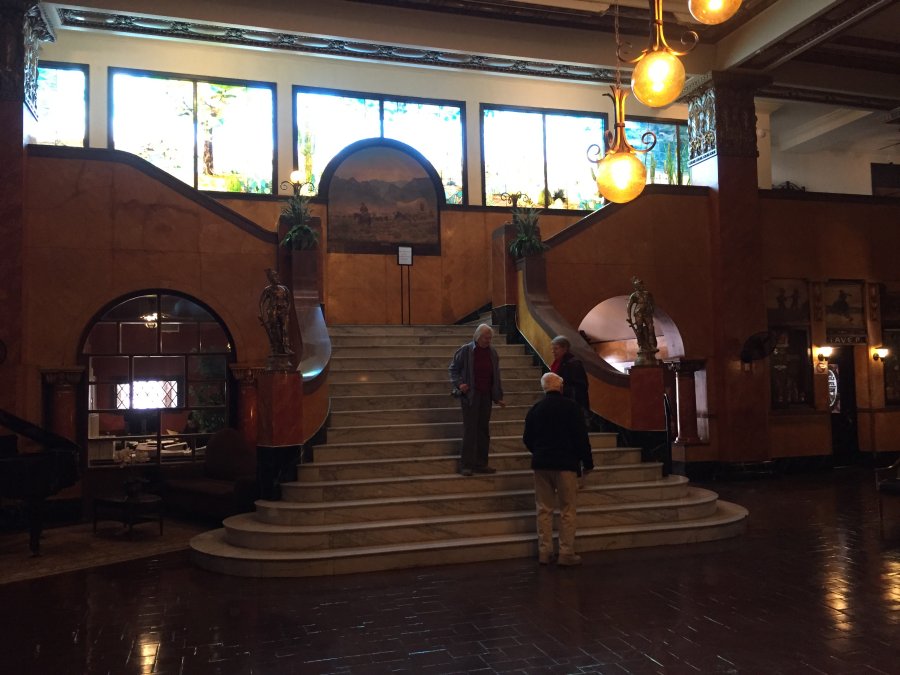 The majestic marble staircase ascends from the hotel lobby. A cracked marble step recalls Pancho Villa once riding his horse into the lobby. Behind the staircase is a Tiffany-style stained glass mural depicting the southwestern desert. |