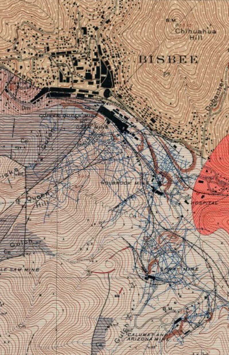 (Above) The Copper Queen orebody was discovered because it was exposed in the hillside across from downtown Bisbee. Mining began at the surface in the “Glory Hole” and then followed the ore deep underground. (Right) Miners eventually developed a maze of horizontal tunnels in several mines (the blue lines on the 1904 US Geological Survey geologic map). Vertical shafts and underground raises connected the horizontal levels to extract the ore. The Copper Queen Mine and the Queen Mine Tour are located in the uppermost part of the mine workings. |  |