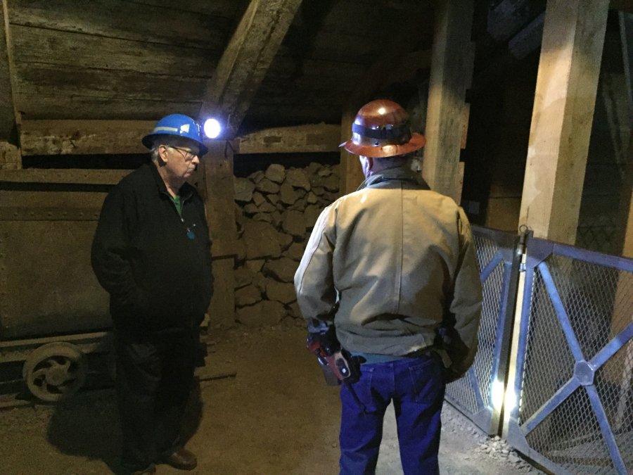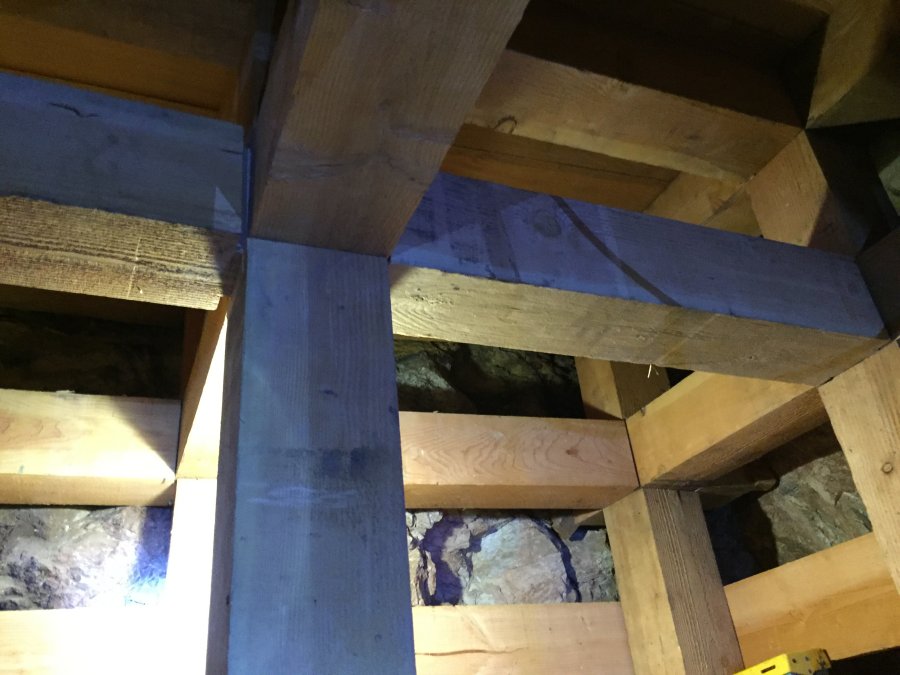 (Above) MHAer, Mike Canty (left), and Doug Graeme, Queen Mine Manager, are at the restored Level 3 Station of the Southwest Shaft which was used to reach deeper ore. (Right) Sturdy timbers support the rock surrounding the station. The shaft was used for hoisting ore in mine cars, lowering explosives and other supplies, and for transporting the miners in the cage.