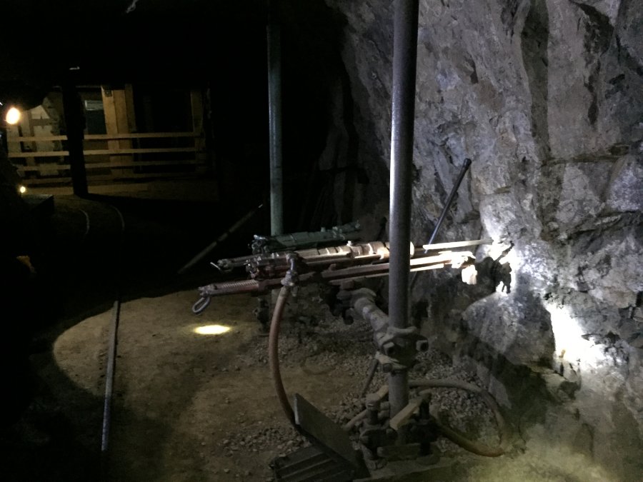 initially, hand drilling was used by the miners to make holes for explosives. Compressed air drills, shown above, were introduced later to increase drilling speeds and reduce costs. |  The ore was mined above the levels in openings called stopes. The broken ore was dropped down chutes to ore cars waiting on the level. The loaded cars were then taken to a shaft. |