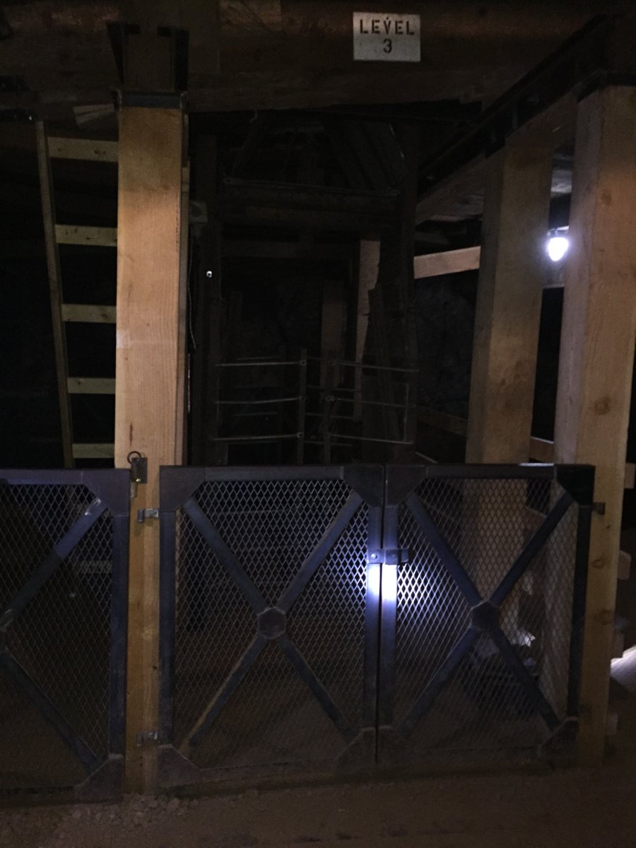The mine train passes the Queen Inclined Shaft. The shaft station is being restored in 2020 using 12” x 12” timbers in an interlocking square set pattern. |