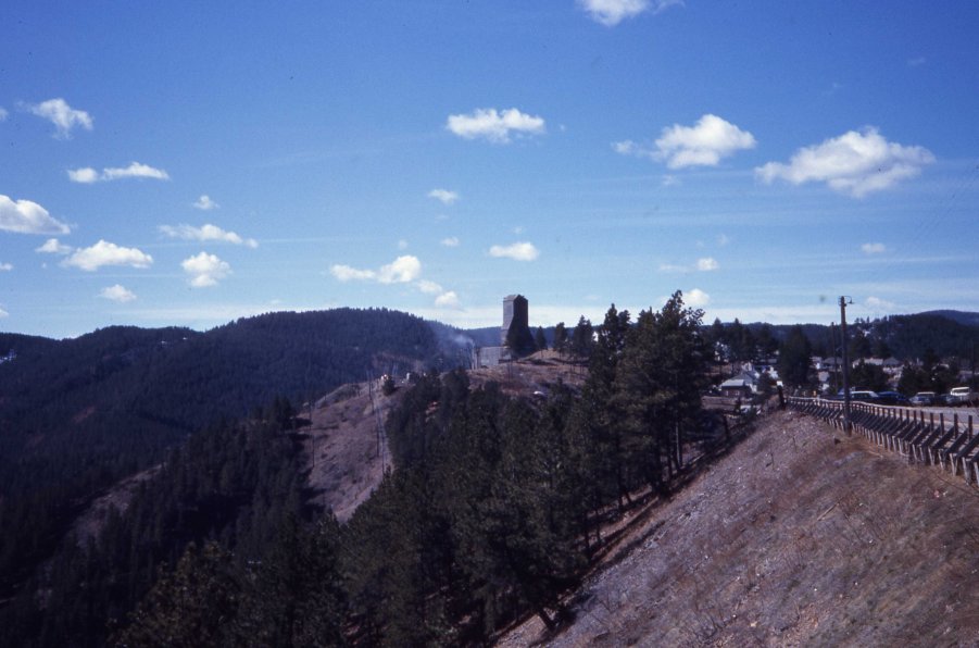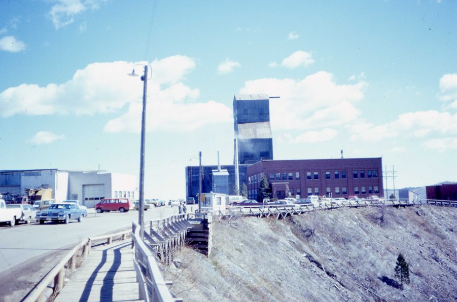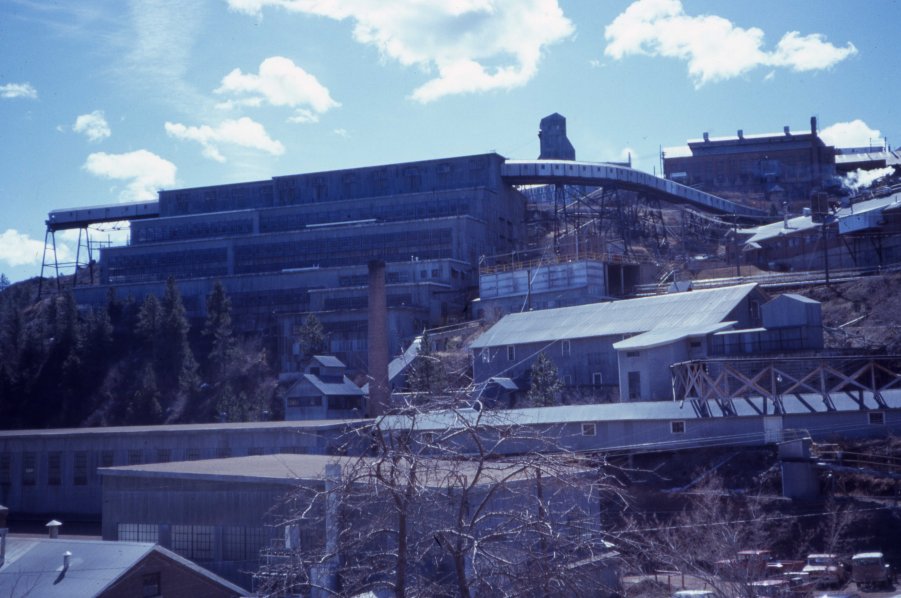 (Above) The headframe of the Yates Shaft is seen towering over the Homestake milling complex. Throughout the long history of the mine, a number of mills were constructed on this hillside so that the ore flow would be assisted by gravity. In the modern mills, cyanide was used to dissolve the gold from the finely ground ore. The gold was then removed from the solution and sent to the refinery. The cyanide was recycled back into the process.