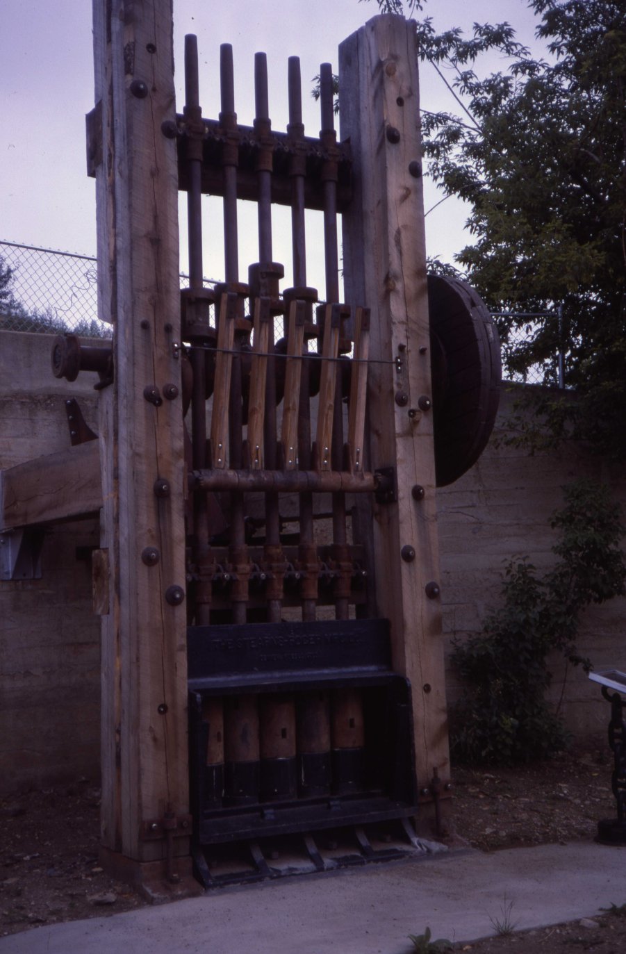 (Left) The early mills used stamps to pulverize the ore and free the gold. In later years, crushers, rod mills, and ball mills were used to free the tiny particles of gold from the rock. The tailings from mill were sent back underground where they were used to fill the stopes to support the ground. This battery of six stamps stands in the city park located on the rim of the open pit. |