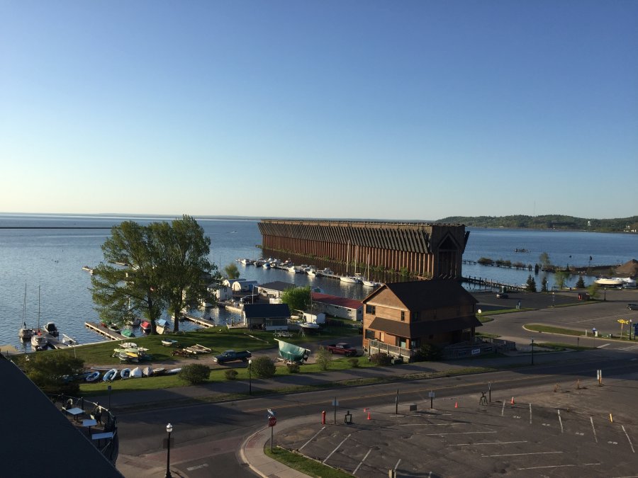 The early morning view from the Landmark Inn, the conference hotel, includes the historic ore dock area and the modern-day marina park.