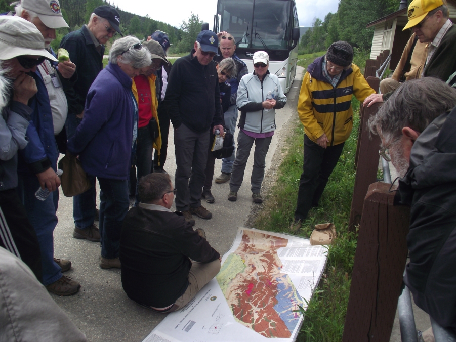 The MHAers receive a briefing on the geology of the Fairbanks District from Tom Bundtzen (sitting).