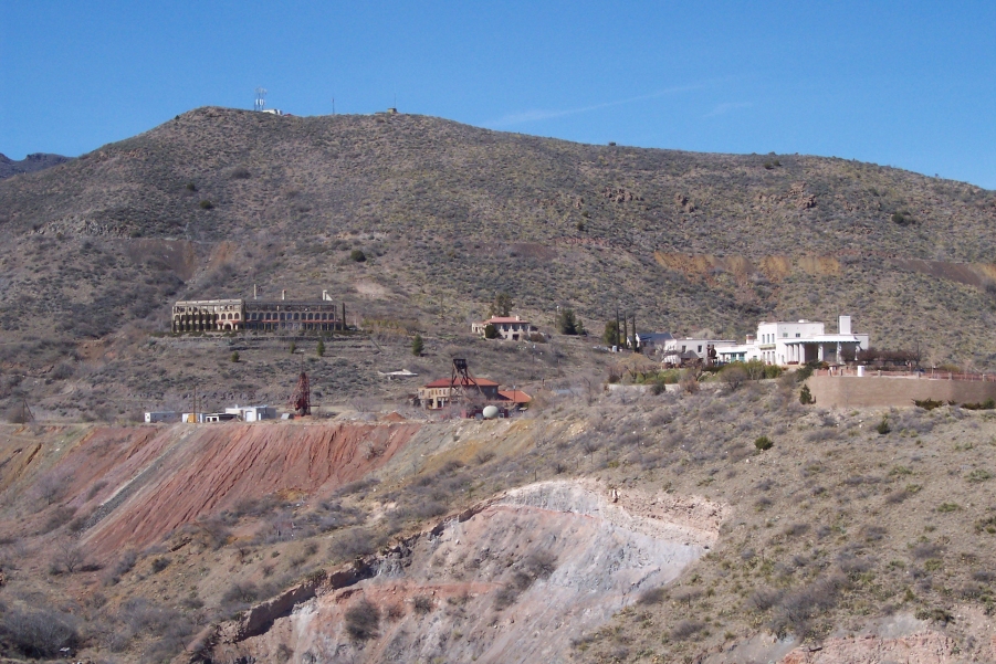 View of the James Douglas Mansion (right) and the headframes of the United Verde Extension Mine. The mine operated from 1914 to 1938.  The mansion is now a state park. The Little Daisy Hotel is at the left rear.