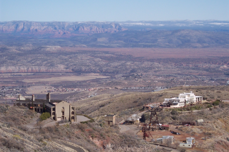 View toward the town of Clarkdale in the valley east of Jerome.  Ore from the William Clark’s United Verde Mine was concentrated and smelted in Clarkdale.  Tailings ponds and the smelter slag pile can be seen in the distance.