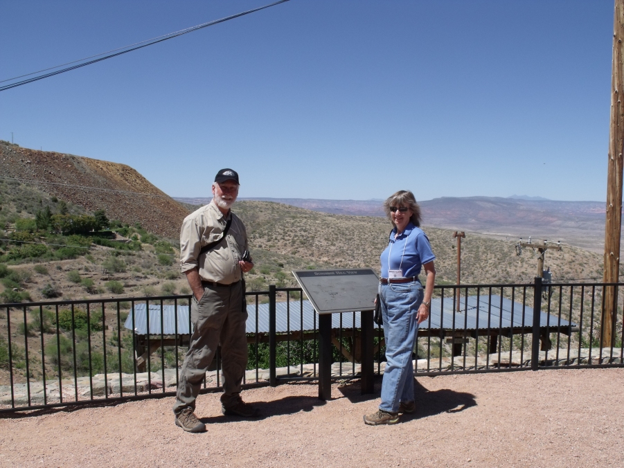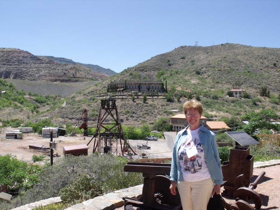 Susan Canty looking across the Audrey Headframe toward the United Verde open pit at the far left.  William Clark’s original smelter once stood to the left of the Little Daisy Hotel.