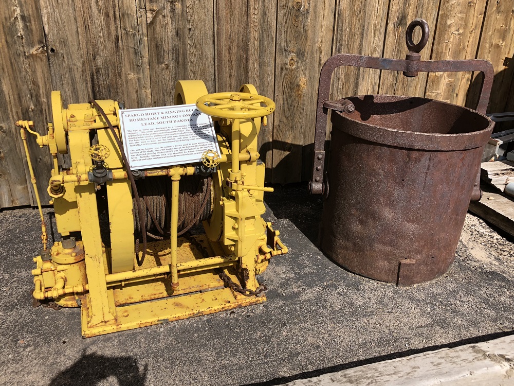 This small air-driven Spargo Hoist and bucket were used for sinking vertical shafts and winzes in the Homestake Mine.