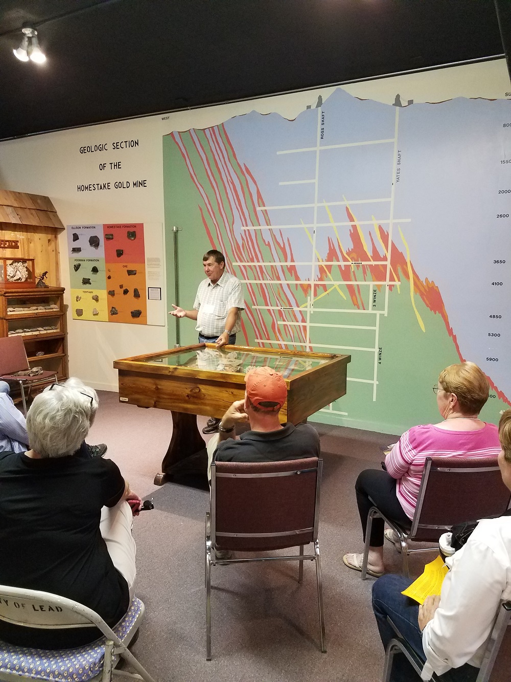 (Left) A museum guide describes the geology and mineralogy of the Homestake Mine.