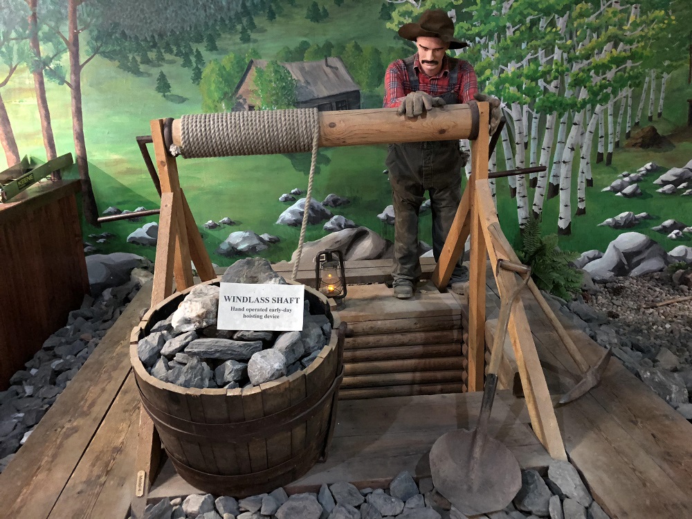 (Above) Well constructed replicas portray scenes of early mining in the Black Hills like this windlass for raising ore and lowering men and supplies in a small mine.