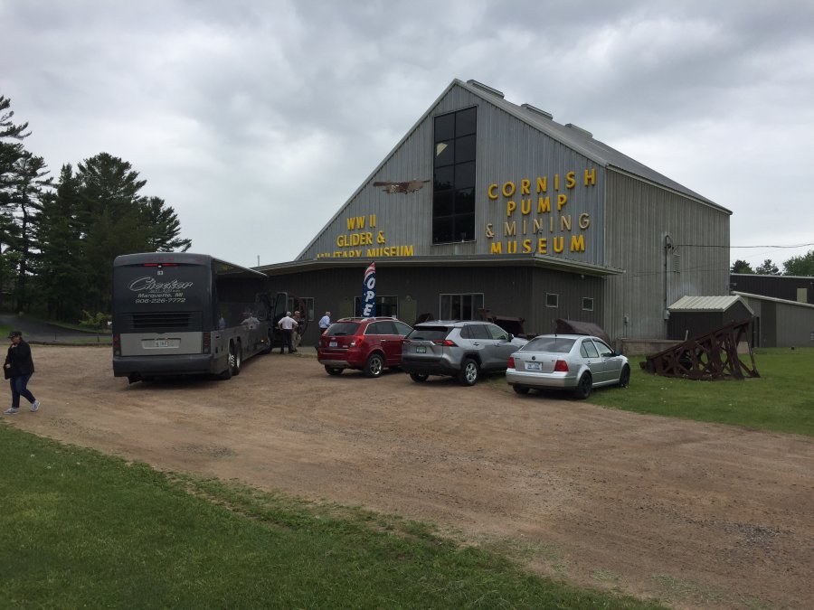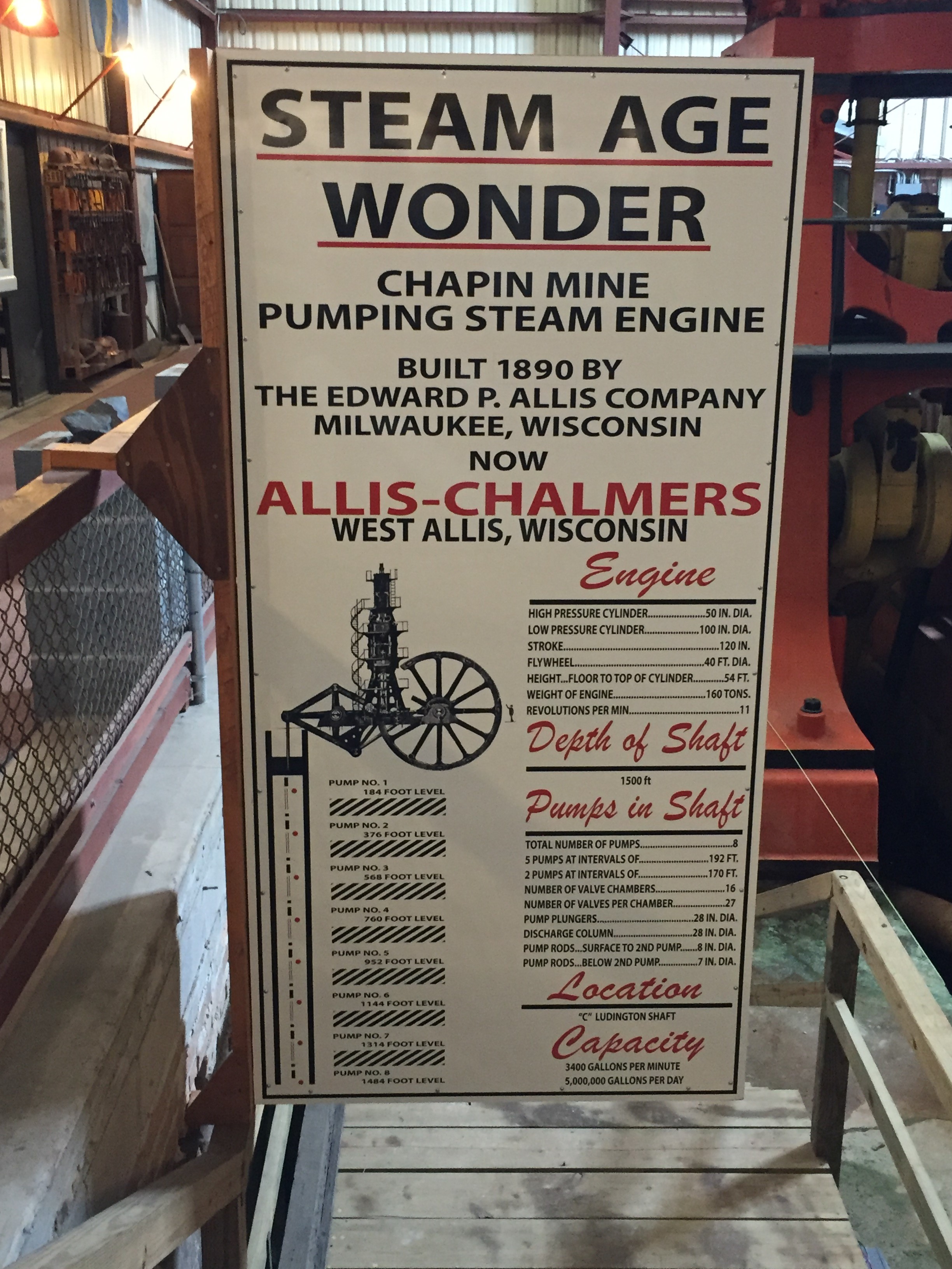 (Above)STOP 3.After briefly crossing into Wisconsin near the old iron mining town of Florence, we arrived at the Cornish Pump and Mine Museum in Iron Mountain, MI.The star attraction is one of the largest steam-driven Cornish pumps ever built; however, the museum also contains an extensive collection of mining equipment from the local mines and another surprise!The pump was designed and built by the E. P. Allis Company of Milwaukee (later Allis-Chalmers Co.) and initially operated at the Chapin D Mine starting in 1893.It was later moved to The Ludington C Mine, where it remains today.It operated until 1914 when electric pumps were installed.CLICK HEREfor a diagram of the pump. (Below)When the Chapin Mine closed in 1934 and pumping stopped, the pit caused by subsidence flooded and formed the lake seen from our bus window as we neared the museum.In 1940, a 150-foot long section of the highway collapsed into the flooded pit.It was quickly rebuilt.