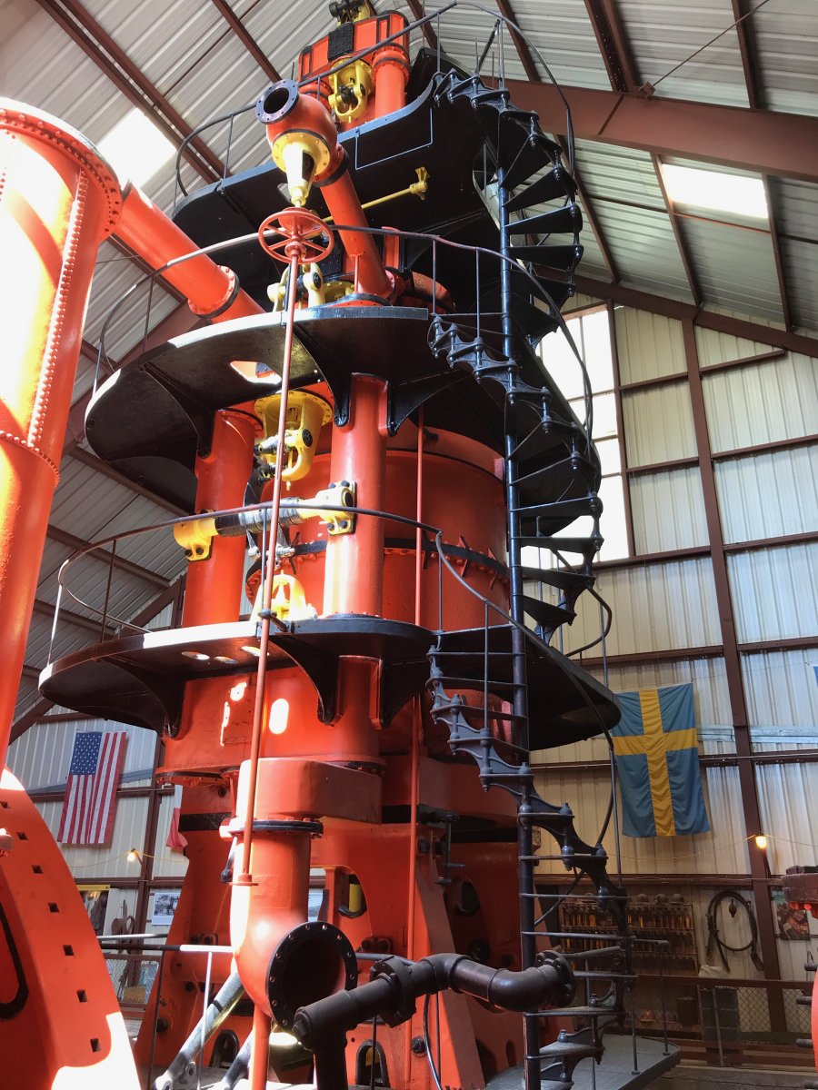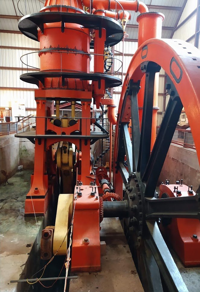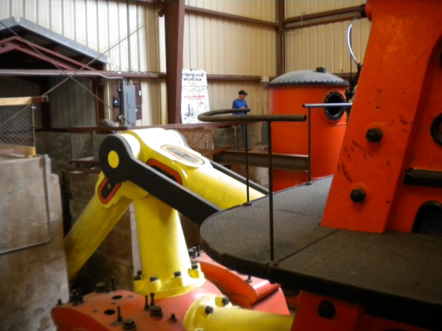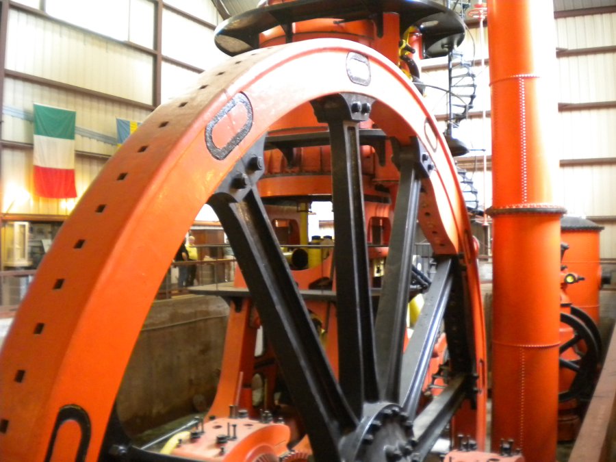 (Above)Once inside the museum, the first impression of the pump is its sheer size (too large for a single photo): 54 feet above the floor; 75 feet long; 100 inch diameter low pressure cylinder; 40 foot diameter flywheel; and weight, 725 tons. It pumped 3,190 gallons per minute.