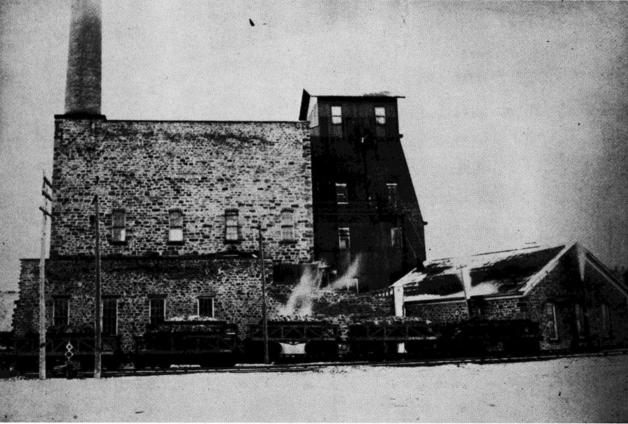 Historic view of the Chapin D Shaft with the stone pump engine house next to the headframe (ca1893).This was the first location of the great Cornish engine.