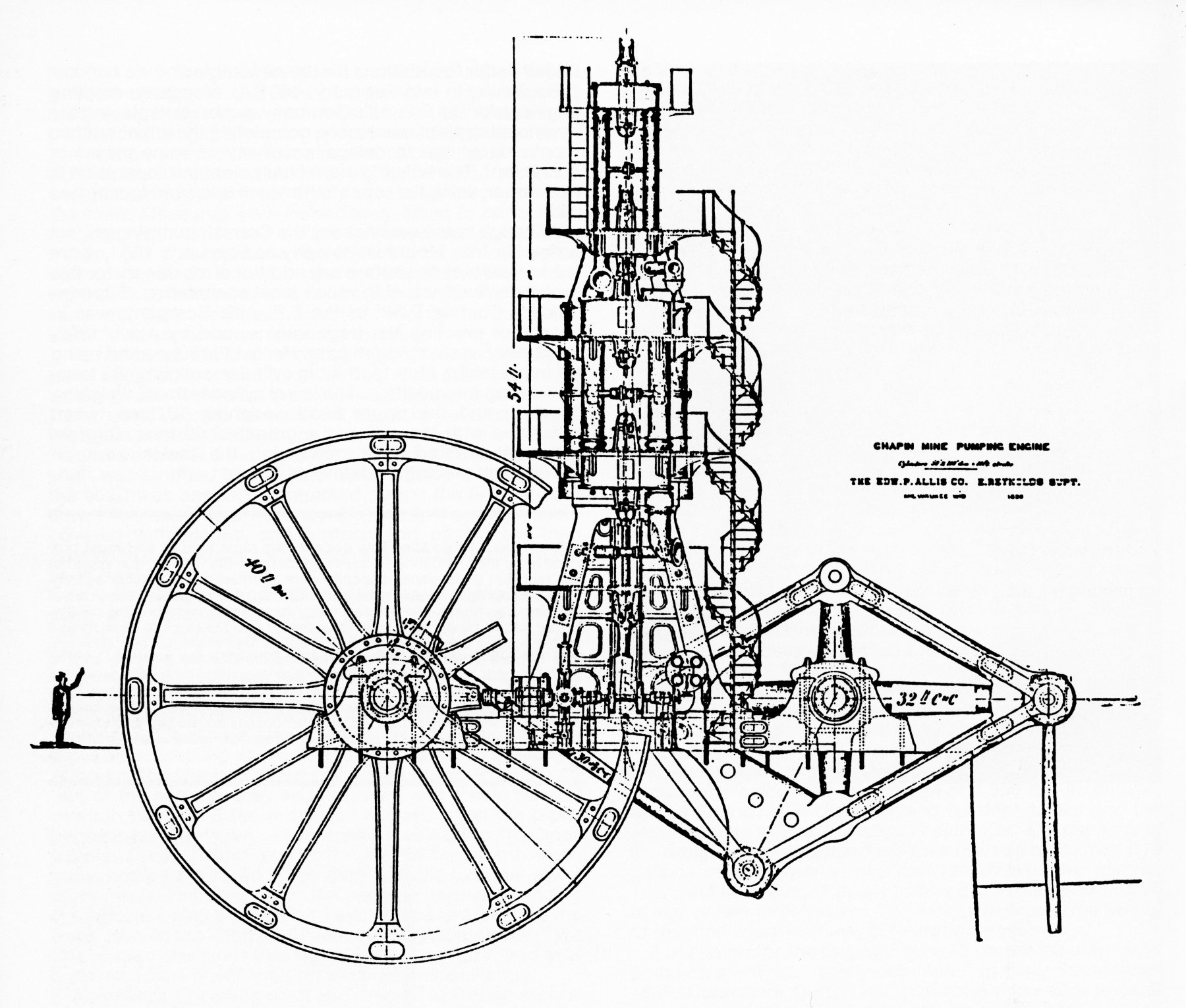 (Below) A “Steam Age Wonder” indeed. The Ludington C Shaft at the Chapin Mine was over 1500 feet deep.Eight sets of pumps at stations down-the-shaft were operated by the pump rod attached to the pumping engine.